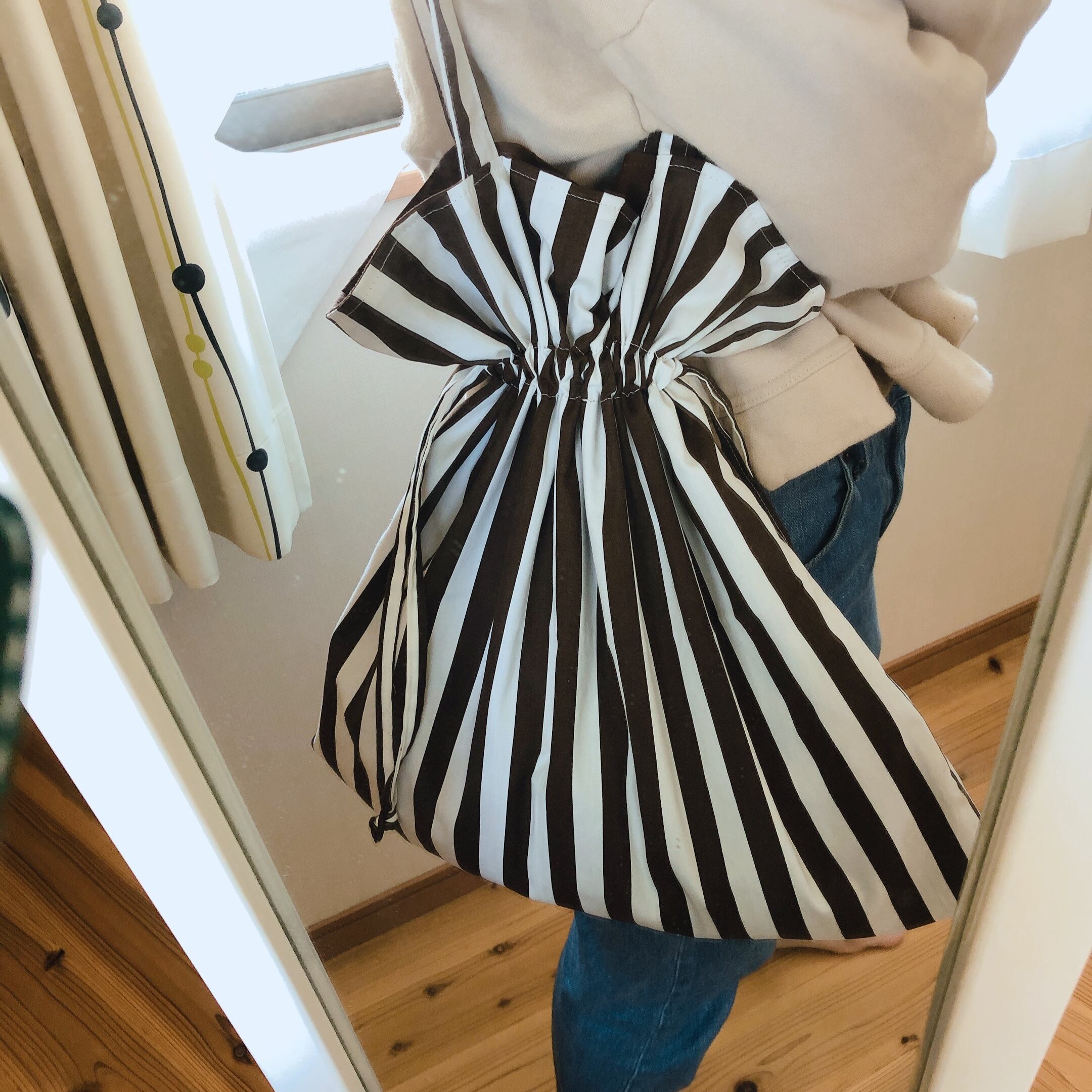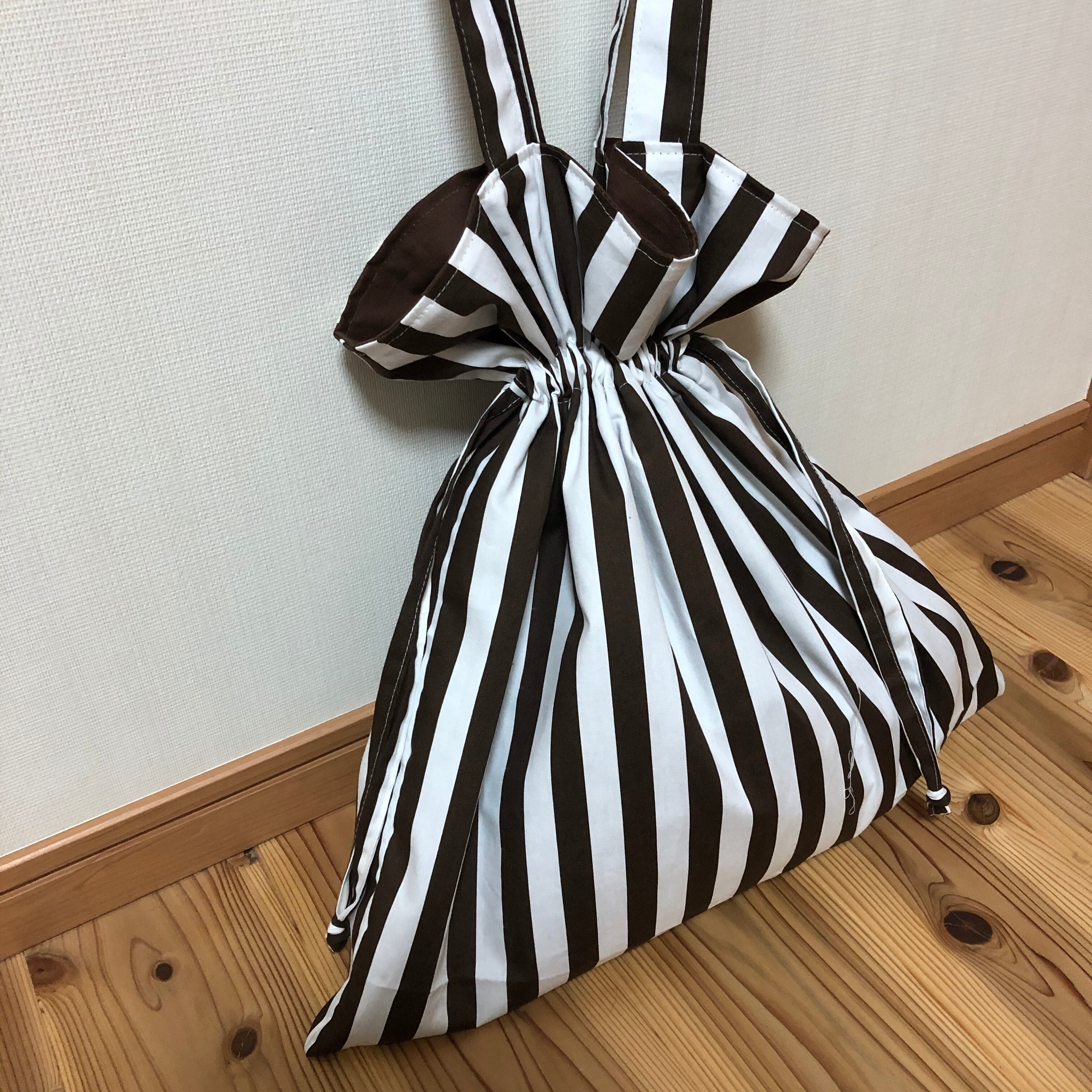 茶色のストライプ生地でお作りした大きな巾着バックになります。