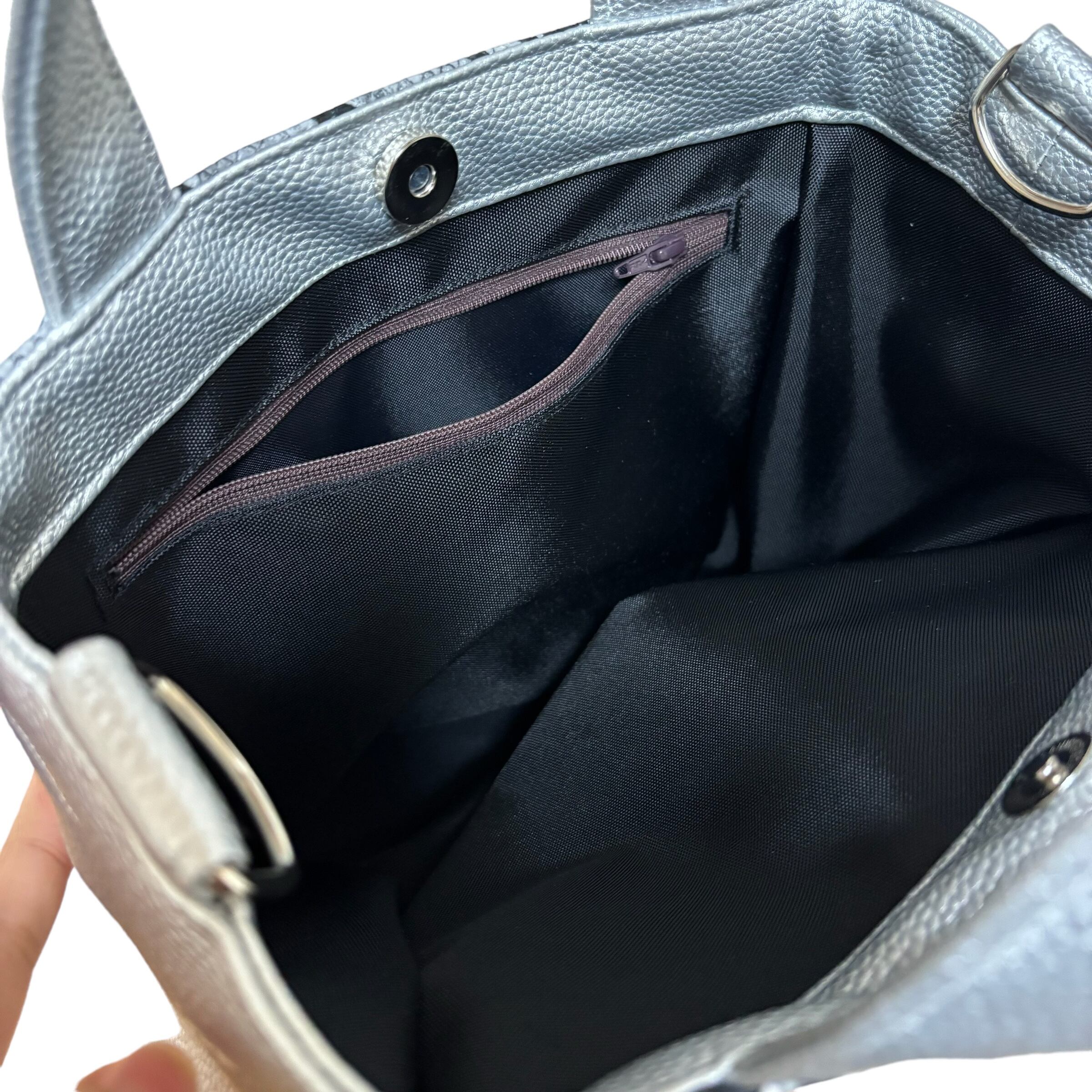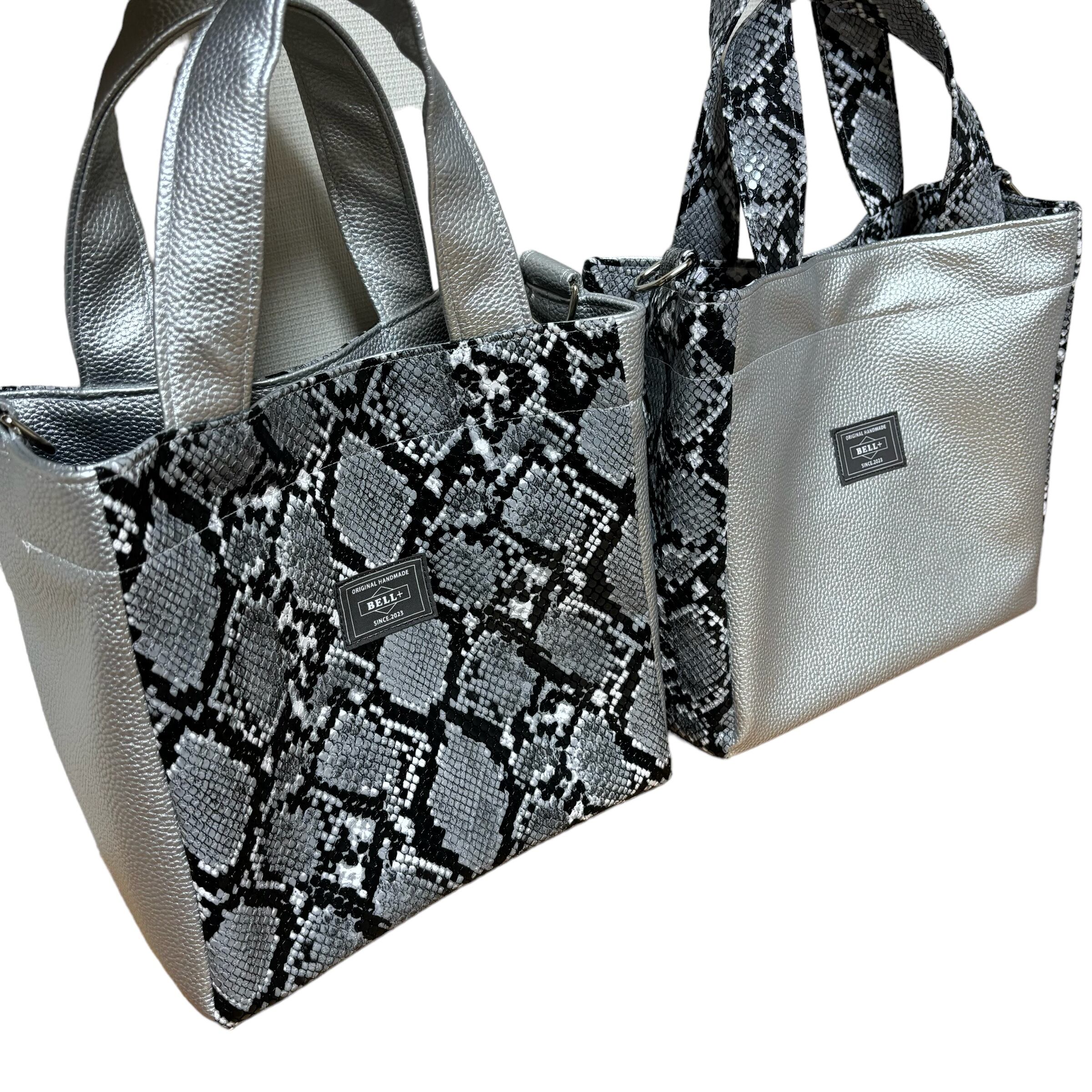 パイソン柄とシルバーのフェイクレザーで作った真四角のトートバッグになります。