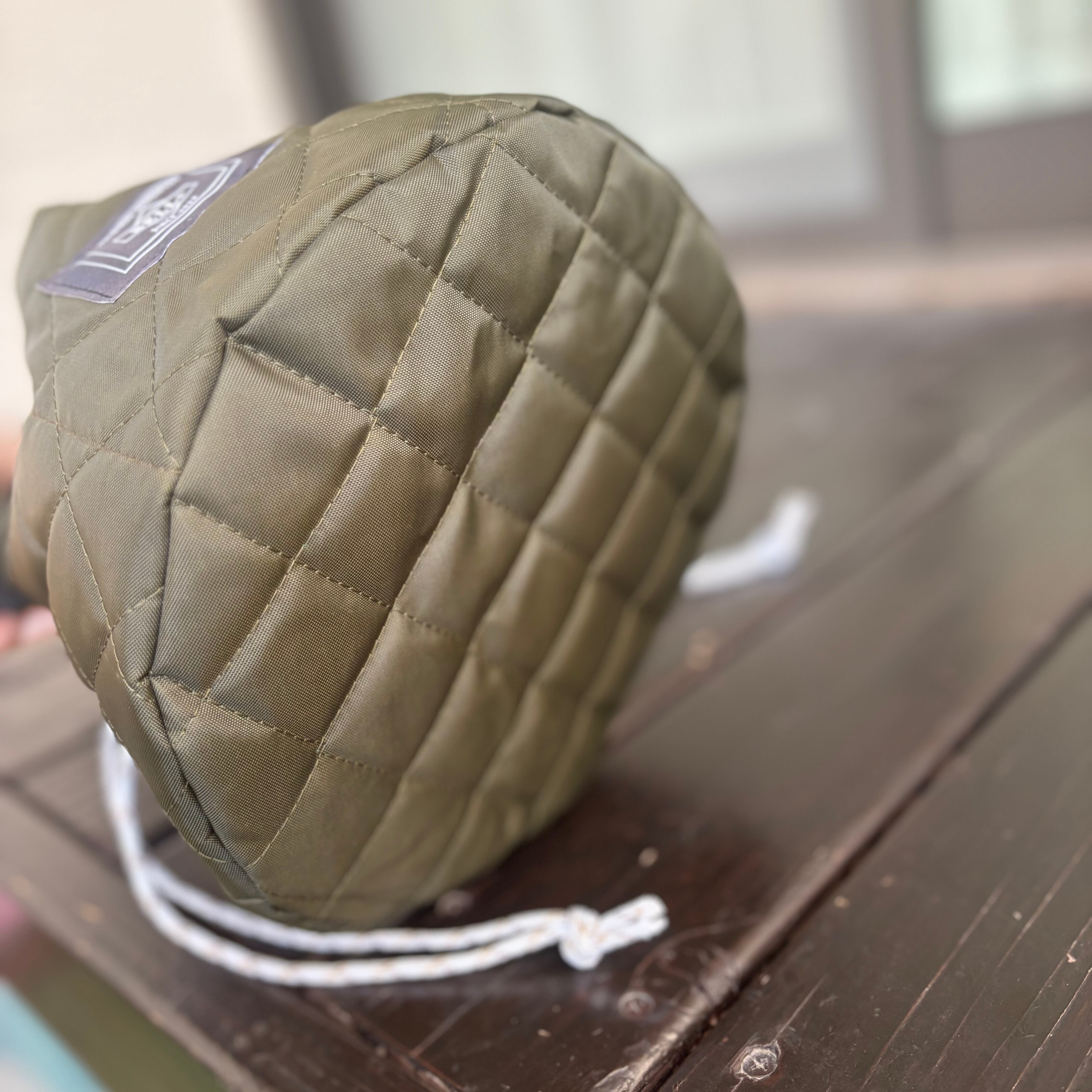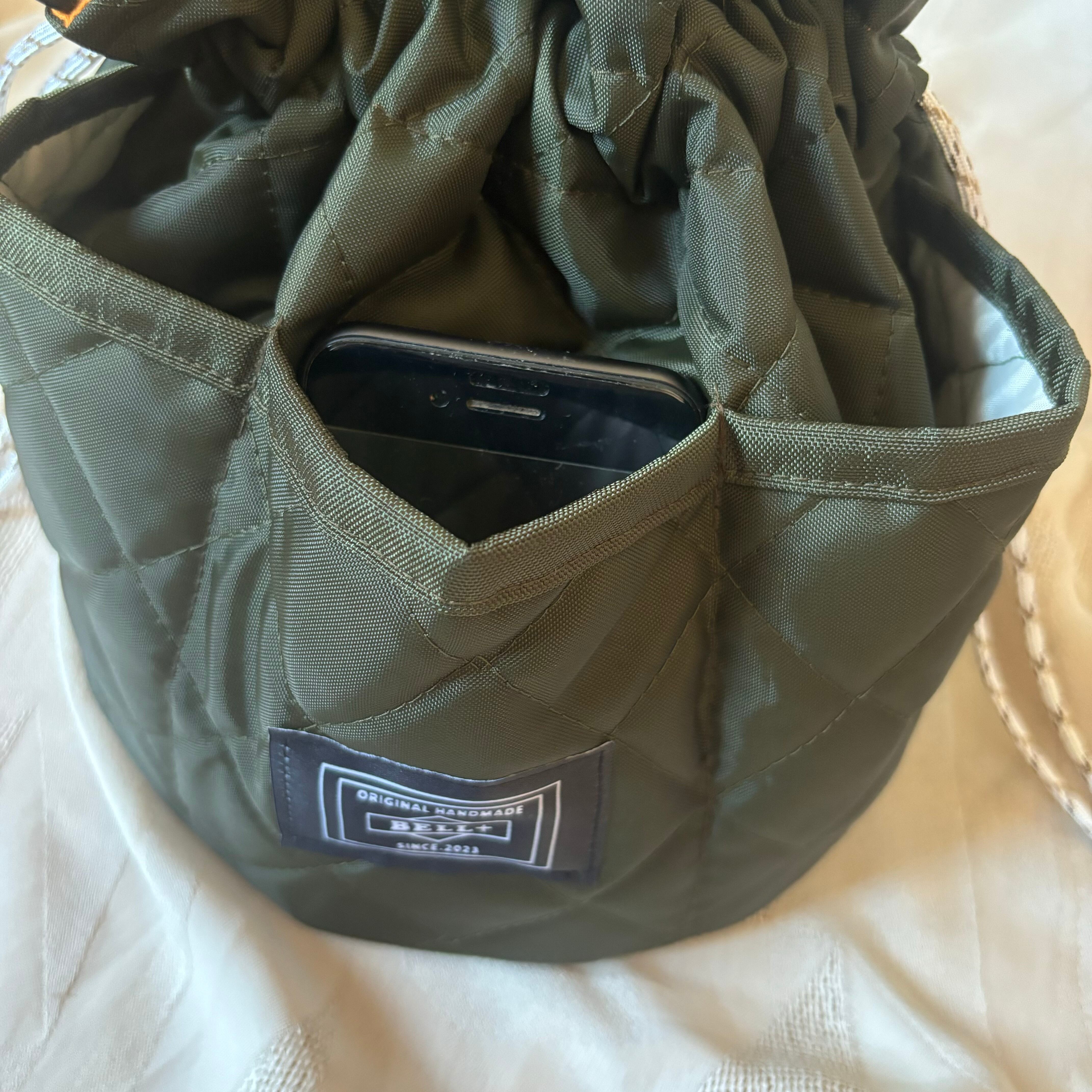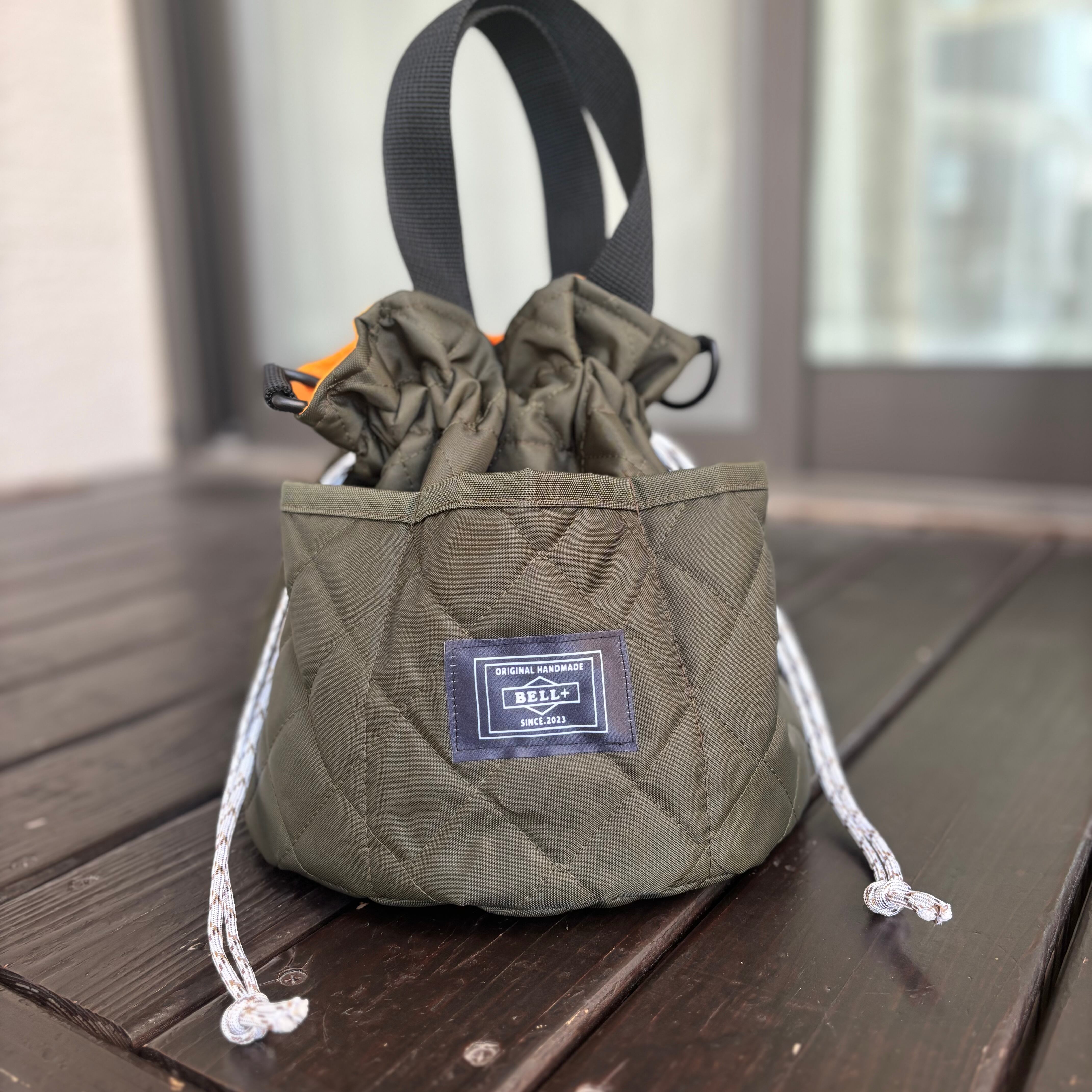 カーキのキルティング生地でつくった丸底巾着になります。